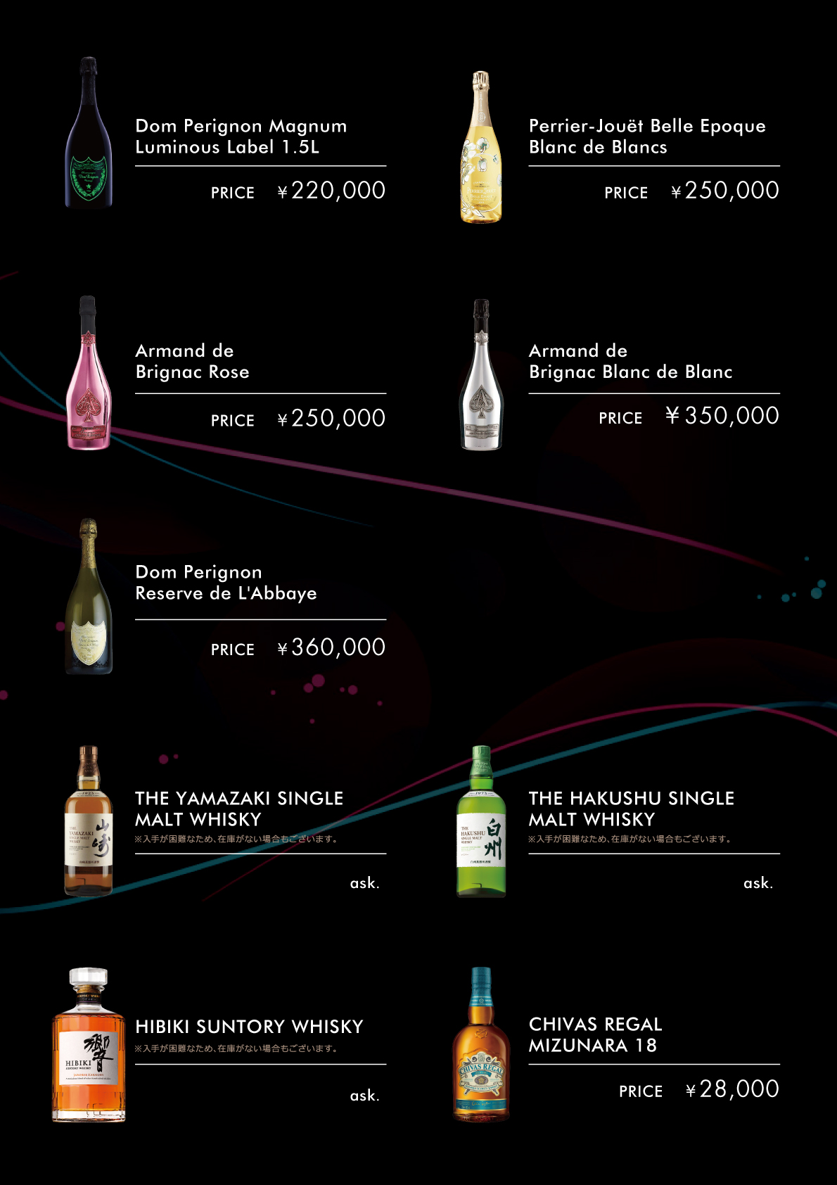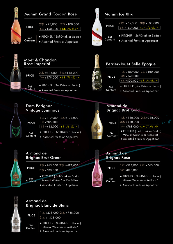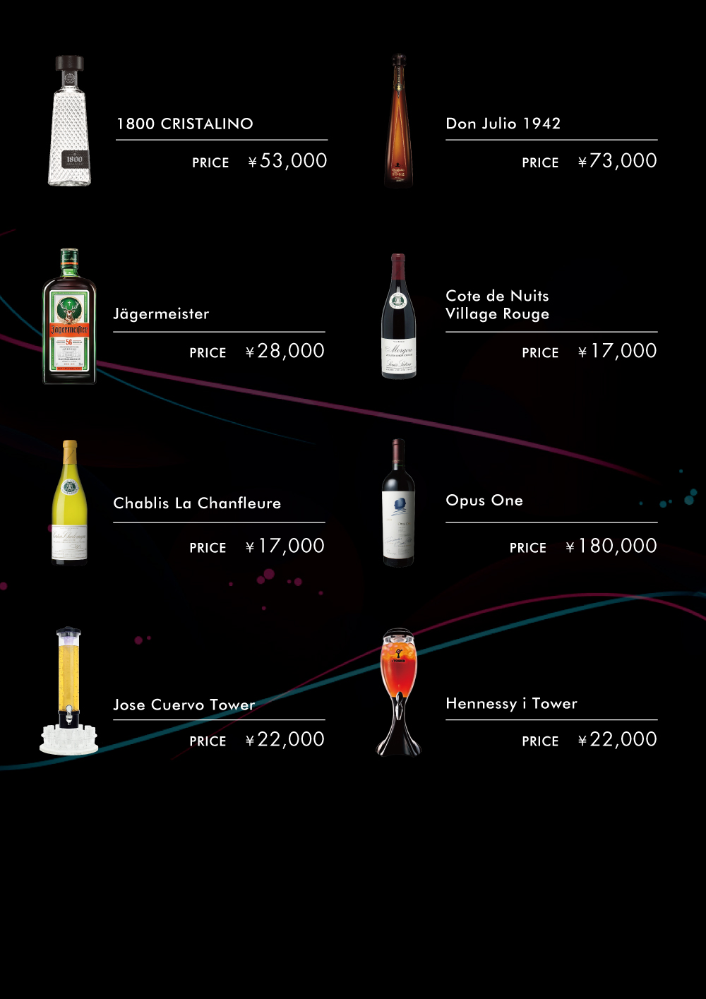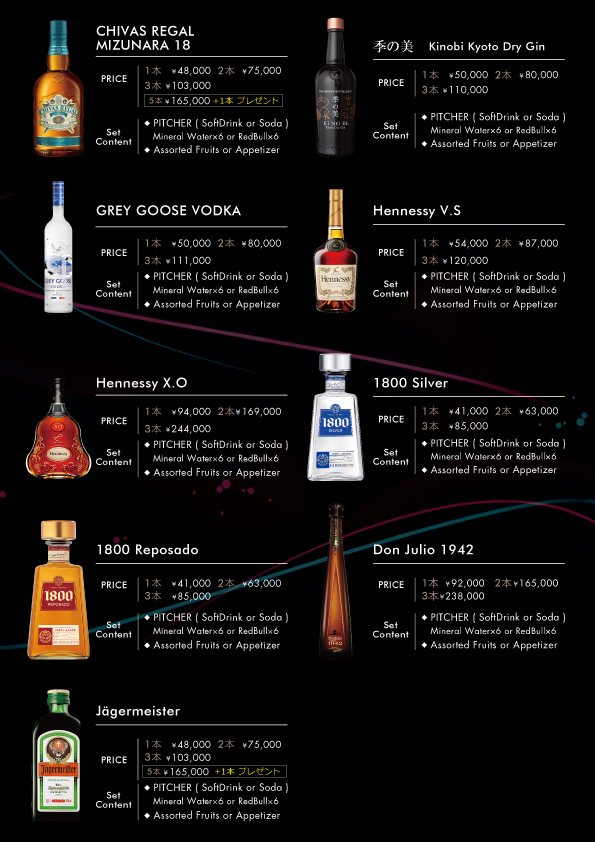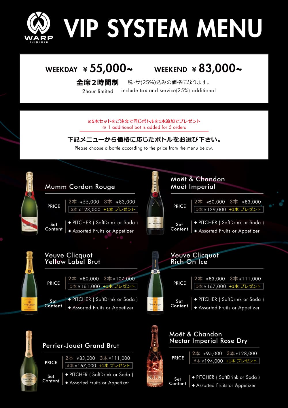 VIP MENU VIP MENU -VIPメニューのご案内- ※画像クリックで拡大表示します VIP SYSTEM MENU VIP SYSTEM MENU 01 VIP SYSTEM MENU 02 VIP SYSTEM MENU 03 VIP SYSTEM MENU 04 VIP BOTTLE MENU VIP BOTTLE MENU 01 VIP BOTTLE MENU 02 VIP BOTTLE MENU 03 VIP BOTTLE MENU 04 VIP BOTTLE MENU 05